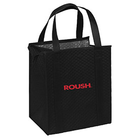 This insulated bag keeps items hot or cold. The insulated Therm-O Tote™ feature durable 238 combined GSM premium non-woven polypropylene exterior, thermal foil interior, dual-reinforced handles, and plastic bottom insert. Complies with CPSIA, C-TPAT, FDA, Prop 65. Roush logo heat press imprinted on the front in red. Size: 13″ W x 10″ D x 15″ H